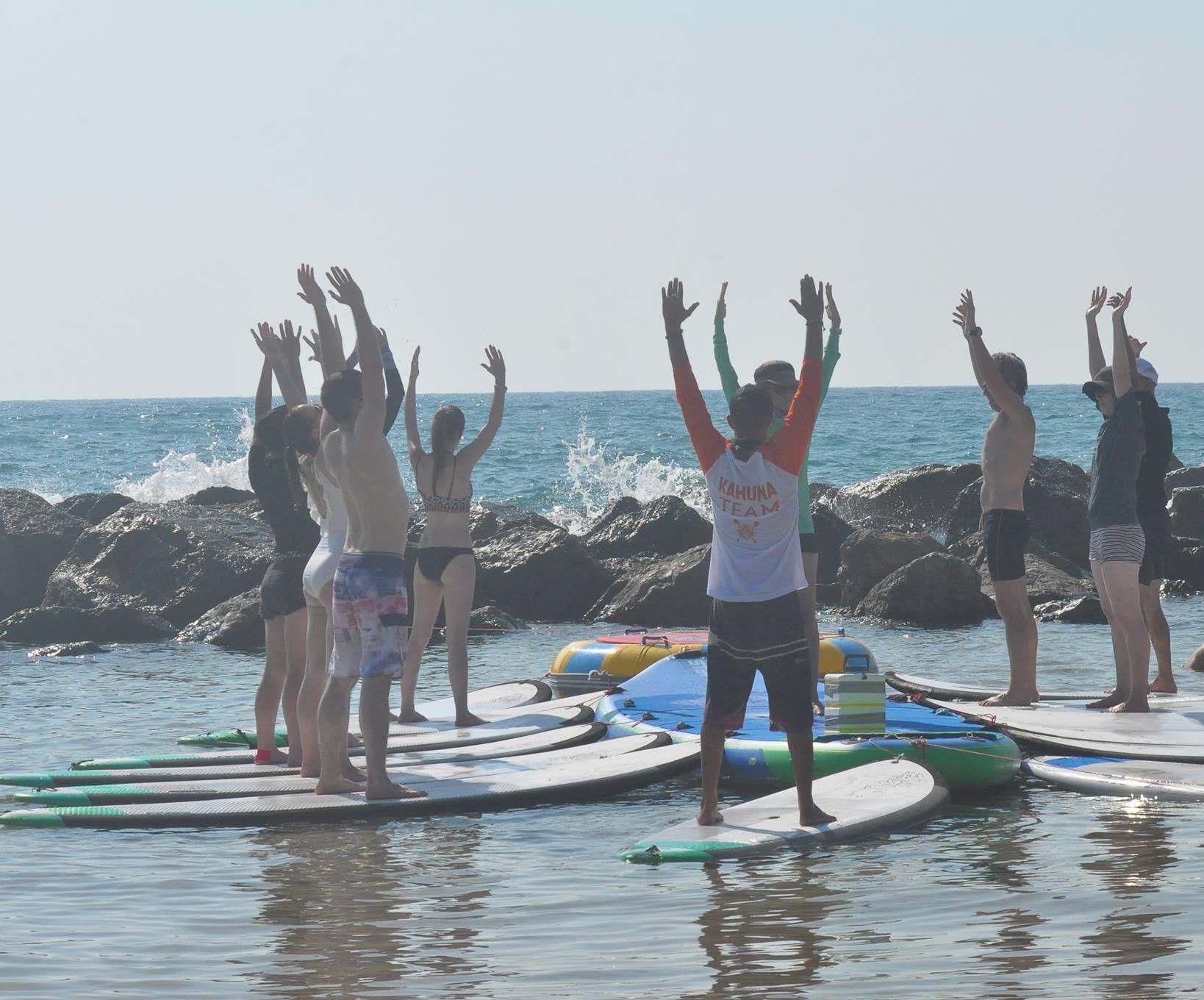 כשהגעתי לים כחצי שעה לפני השיעור, הכל כבר היה מאורגן למופת על ידי הצוות של קהונה סרפ קלאב. כל הסאפים היו מעוגנים לסאפ המרכזי, במים הרדודים ליד שובר הגלים. כשעליתי על אחד הסאפים כדי לקבל תחושה של איך הים ואיך זה לתרגל סאפ יוגה כשהסאפ מעוגן לסאפ מרכזי גדול, הופתעתי לגלות שזה הרבה יותר קל מאשר בתנאים שאני תרגלתי בהם. זה אפשר לעשות את כל תנוחות היוגה הרבה יותר בקלות מהתנאים בהם תרגלתי לבדי, אבל עדיין להרגיש את האתגר עקב התרגול על הסאפ.